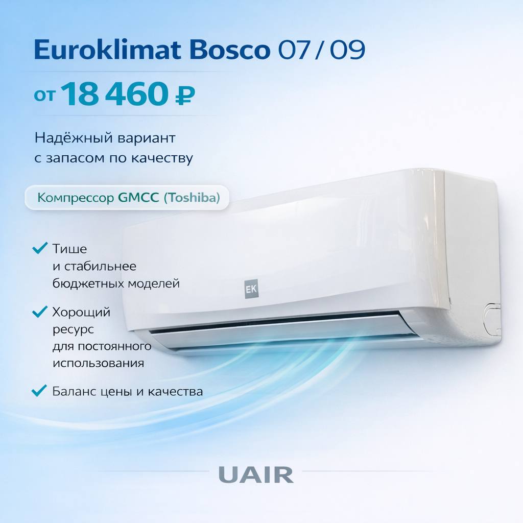 В UAIR мы собрали бюджетные кондиционеры до 20 000 ₽, которые подходят для помещений 18–22 м², стабильно работают в жаркое время года и закрывают базовую задачу охлаждения.